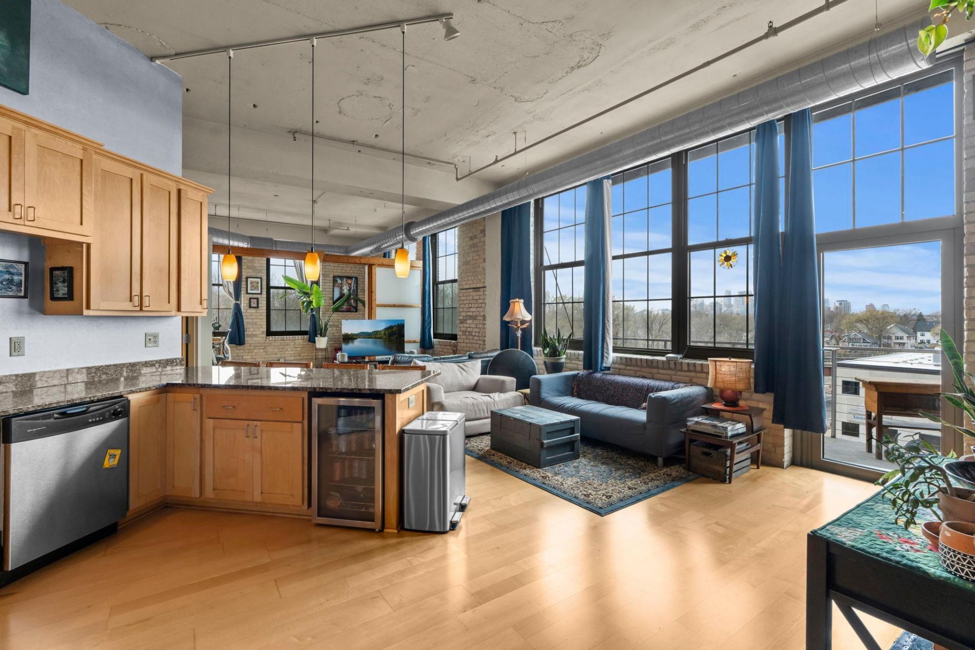 Rare opportunity to own a spacious 2-bedroom condo in 1901 Lofts, the iconic former Glidden Paint building ? now a boutique community of 45 distinctive residences.Soaring 12.5 foot ceilings and expansive west-facing windows fill the unit with natural light and showcase stunning sunset and downtown skyline views from the unit and the private deck. True loft character shines with exposed brick and concrete, plus visible ductwork for an authentic industrial feel. The kitchen offers granite countertops and stainless steel appliances, along with counter seating and a flexible dining area currently used as a living room space. Additional highlights include gleaming maple floors, in-unit laundry, two walk-in closets, a spacious, welcoming foyer, and a dedicated storage locker (#23).Parking is exceptional with heated underground space #1, outdoor space #9, and complimentary guest parking. The building also features an elevator and a new security system.Recent unit improvements include three new windows and new door with transom window along the deck, plus a new stainless steel gas range, microwave, and beverage fridge. The building installed a new roof as of 2022. The seller also has the furnace, central air, and water heater professionally serviced seasonally.Located steps from the Minneapolis Diagonal Bike Trail, and neighborhood favorites such as Up Coffee Roasters, Norseman Distillery, Steady Pour, Falling Knife Brewing Company, Zaika Deli, and Insight Brewing - you'll enjoy the best of Minneapolis living. Suburban shopping favorites within 5 minutes include the Costco Business Center (with gas pumps), Target, Cub, and Home Depot. Or check out sporting events at Target Field and Target Center being only 10 minutes from downtown Minneapolis. You will love how centrally located this unit is with easy access to 35W, Hwy 280, and Hwy 36. Be sure to add this to your list of must see properties.